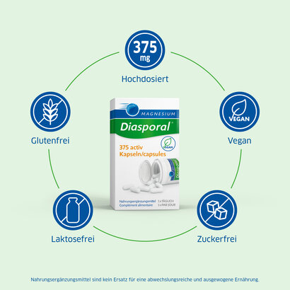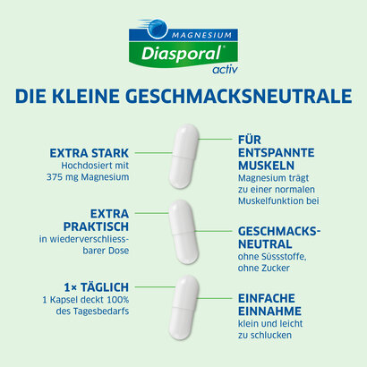 Le capsule sono insapori, piccole e quindi facili da deglutire. Ciò consente un rapido apporto di magnesio e le rende un pratico compagno quotidiano. Il barattolo richiudibile è adatto anche per quando si è in viaggio. Le capsule Magnesium-Diasporal 375 activ sono la variante di prodotto ideale per tutti coloro che sono spesso in movimento nella vita quotidiana.