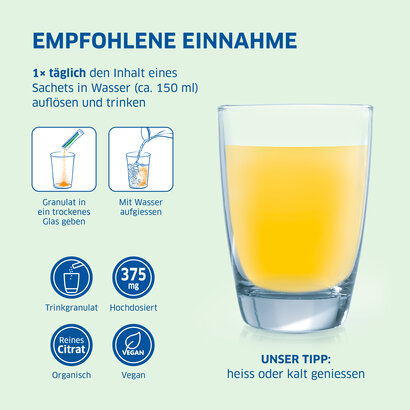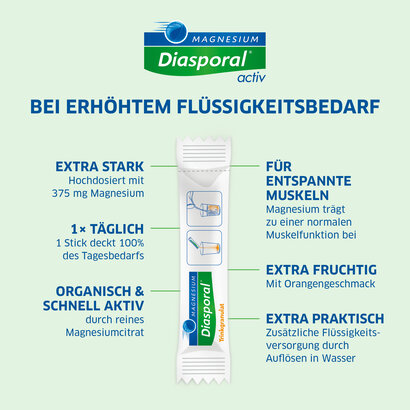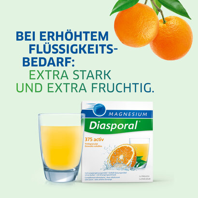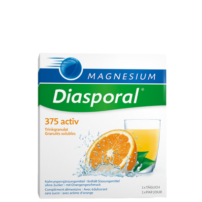 Magnesium-Diasporal 375 activ contiene citrato di magnesio puro, un composto organico delicato per l’organismo e ad azione rapida. È particolarmente indicato per le persone con un elevato fabbisogno di magnesio. Il granulato da bere ha un sapore extra fruttato e apporta all’organismo ulteriori liquidi.
