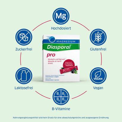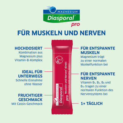 Per poter affrontare le sfide della vita quotidiana - ad esempio al lavoro, all’università, a casa e nel tempo libero - abbiamo bisogno di muscoli e nervi sani. Magnesium-Diasporal pro Muscoli e nervi direct offre un importante contributo in tal senso: