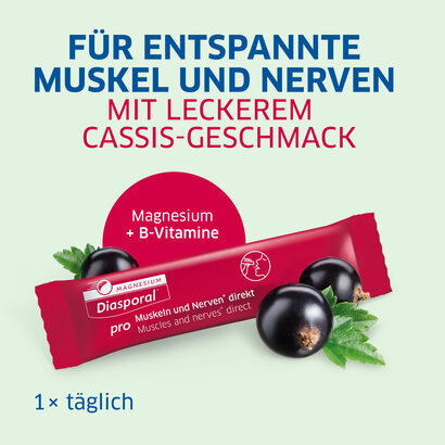 Magnesium-Diasporal pro Muscoli e nervi direct è una preparato che combina magnesio ad alto dosaggio e di complesso vitaminico B. Il granulato orosolubile è ideale quando si è in viaggio poiché può essere assunto velocemente e senza liquidi. Ha un piacevole gusto di cassis e contiene magnesio citrato, ossido di magnesio e le vitamine B1, B2, B6 e B12.